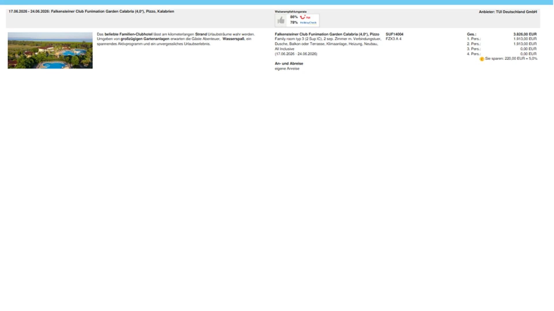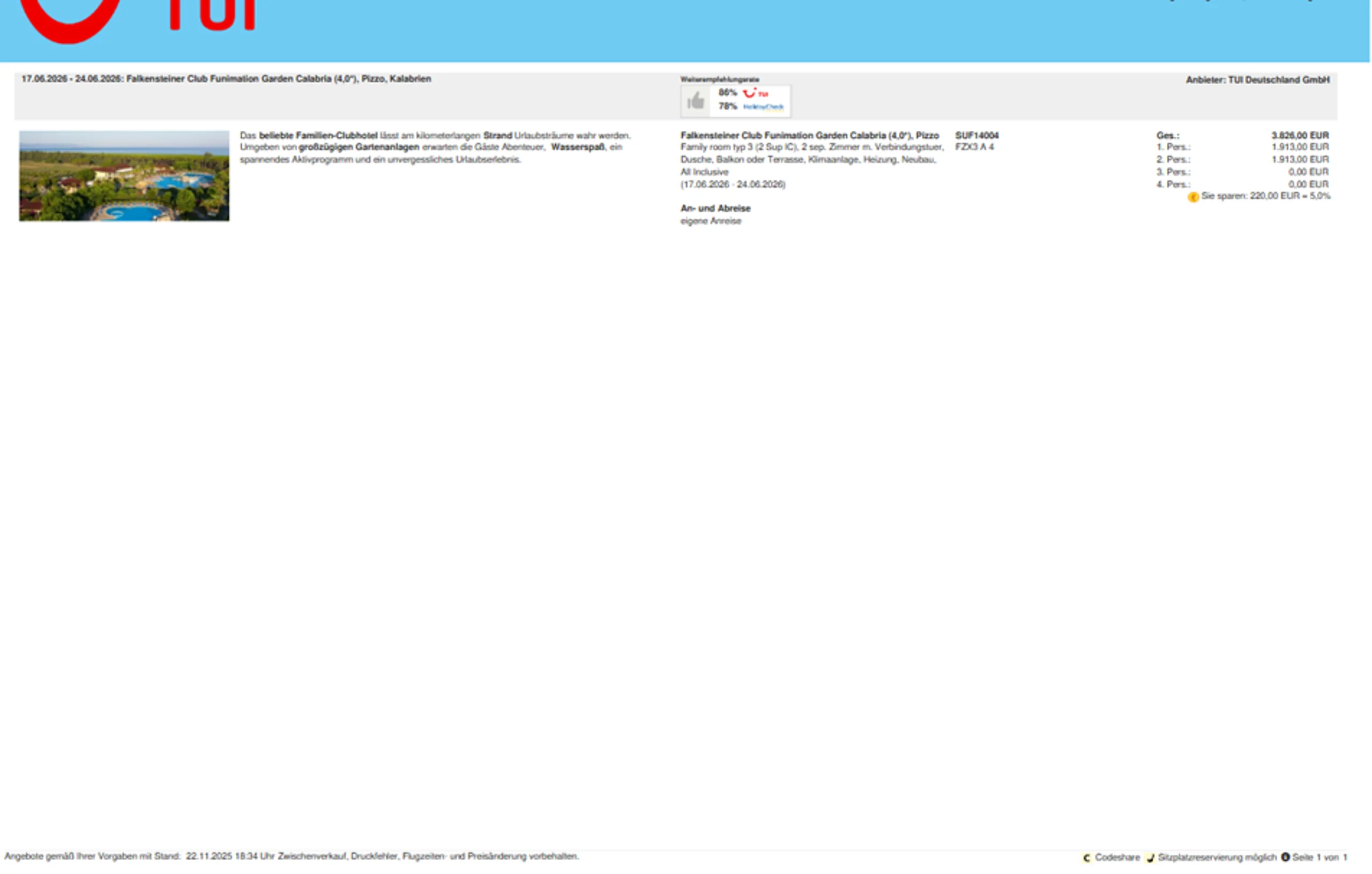 Das Hotelzimmer bucht das Reisebüro beim Reiseveranstalter in dem Fall TUI: 3826 EUR und heute, wo ich das Angebot herausgesucht habe, hat TUI sogar mit Kinderfestpreis geworben.