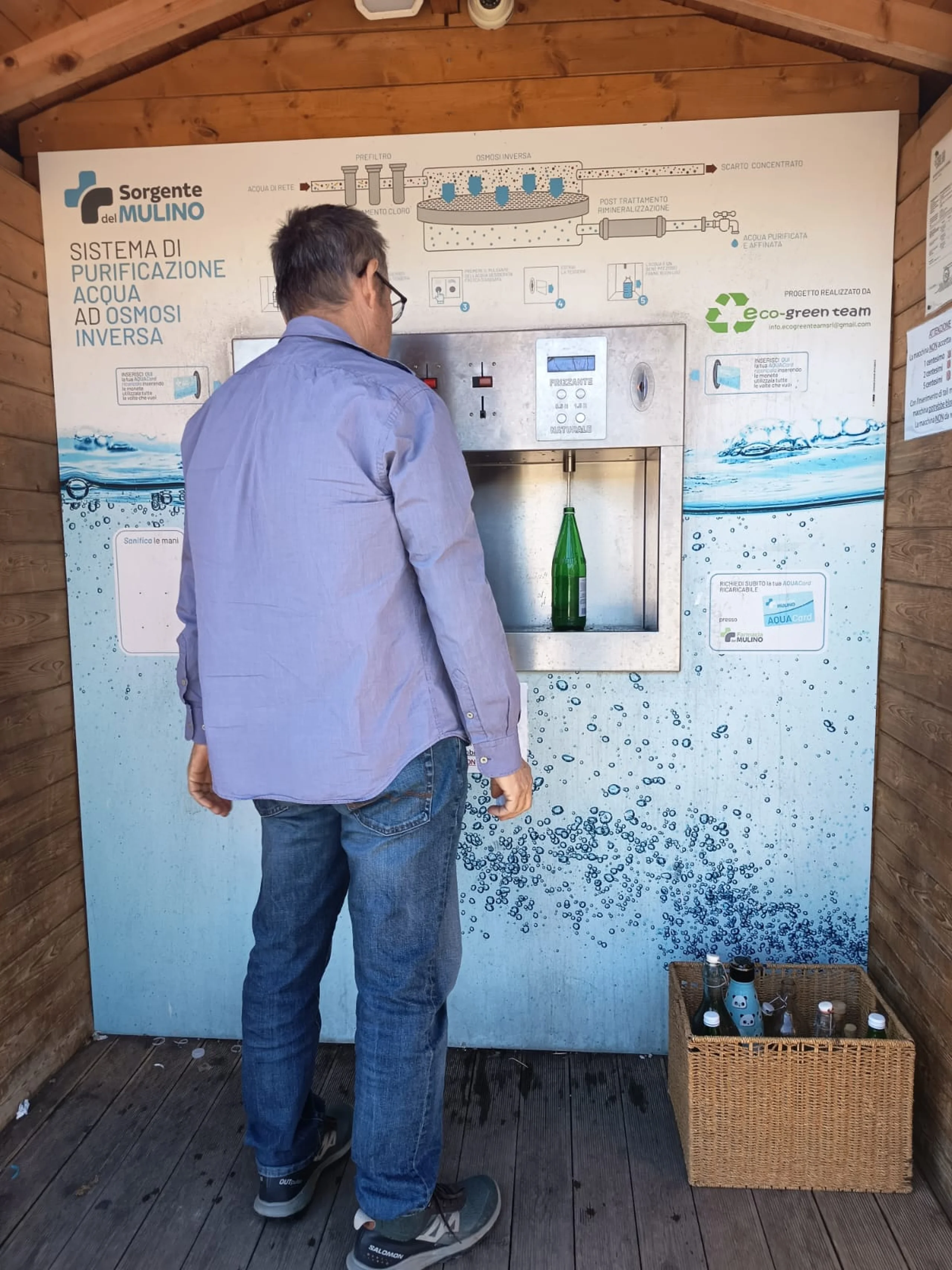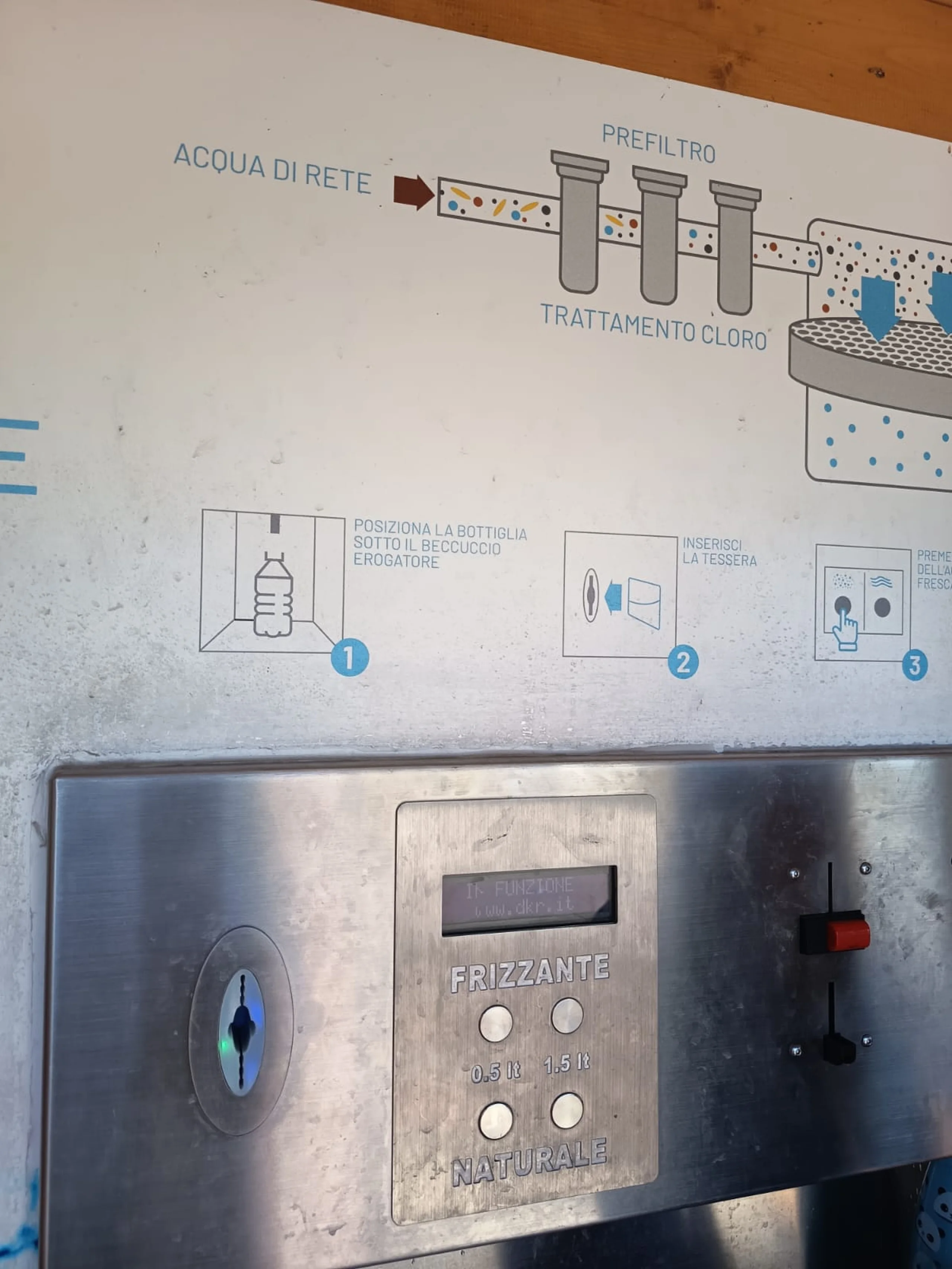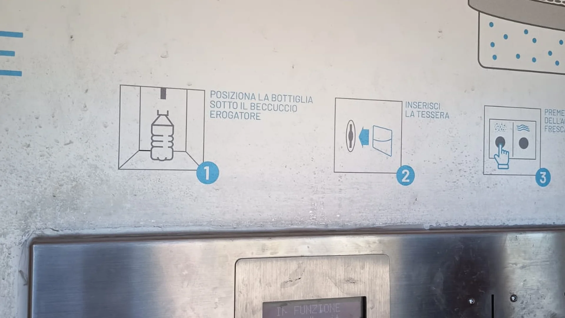 Das ist ein kleines Häuschen, in dem man sich gefiltertes, sauberes Wasser abfüllen kann. In der Apotheke bekommt man eine Karte, die man mit einem Betrag auflädt. Mit dieser Karte kann man dann rund um die Uhr Wasser holen – und sie direkt am Automaten mit Münzen wieder aufladen.